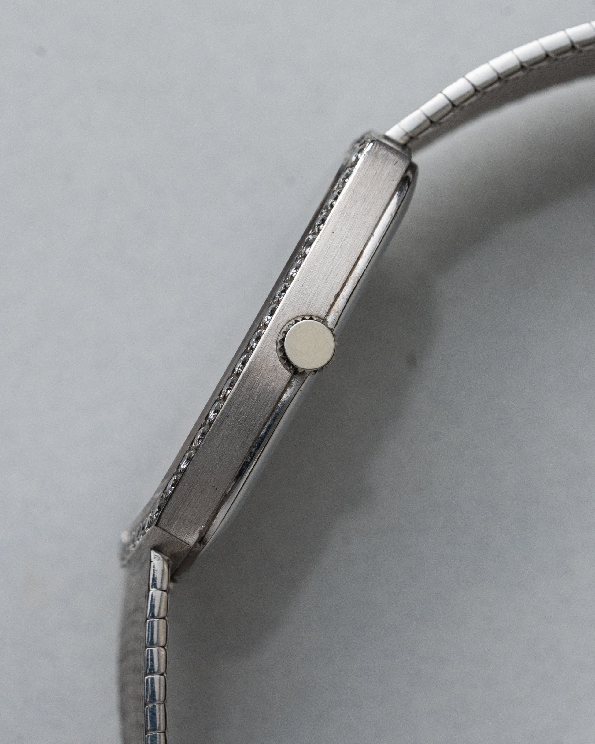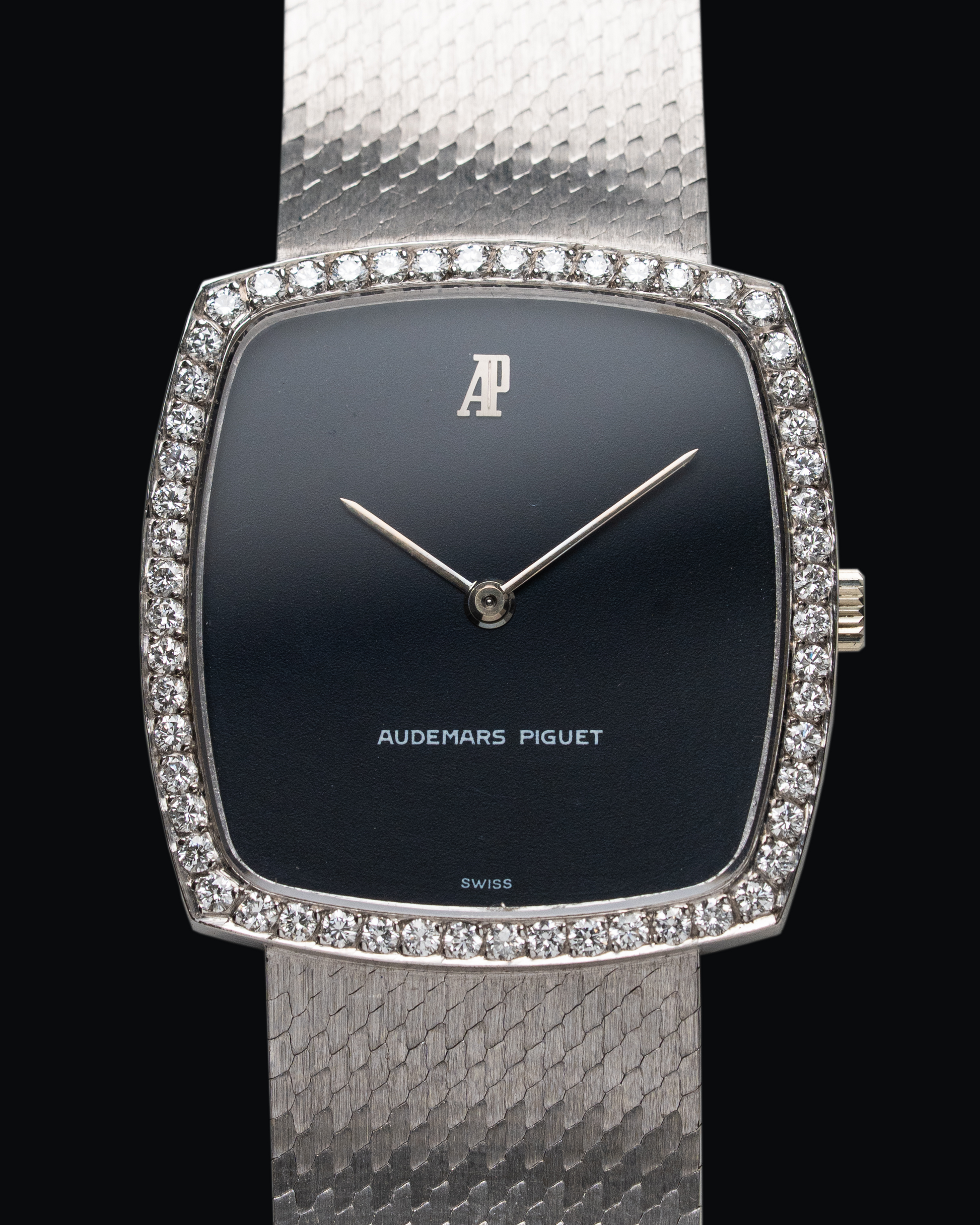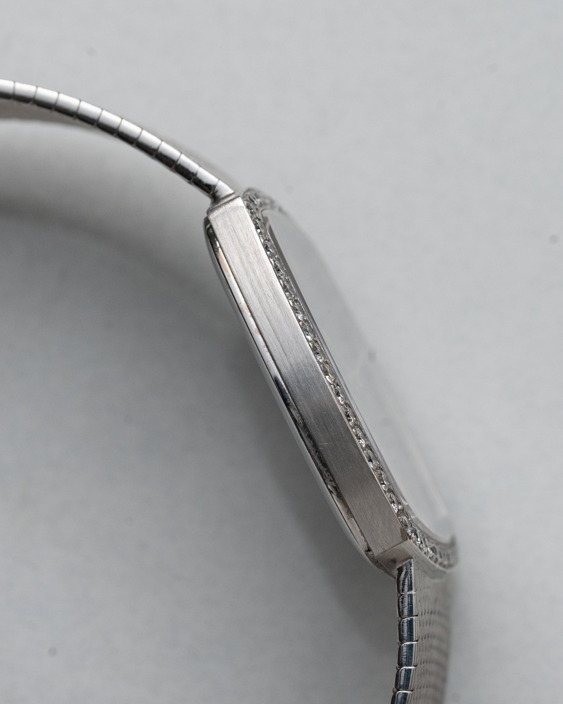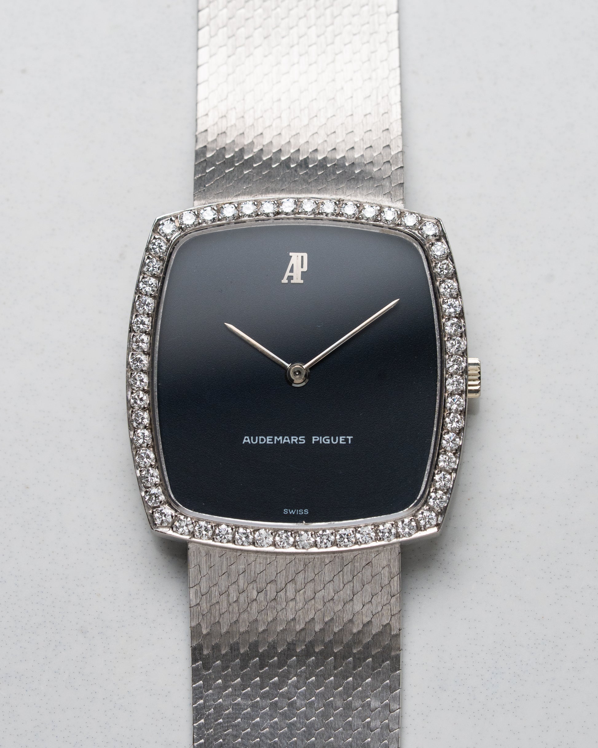 Audemars Piguet TV es una joya de la alta relojería que combina la elegancia del diseño setentero con el lujo absoluto del oro blanco y los diamantes. Con su distintiva caja de forma de tv y su bisel engastado en diamantes, esta pieza encarna la fusión perfecta entre arte, exclusividad y sofisticación suiza.